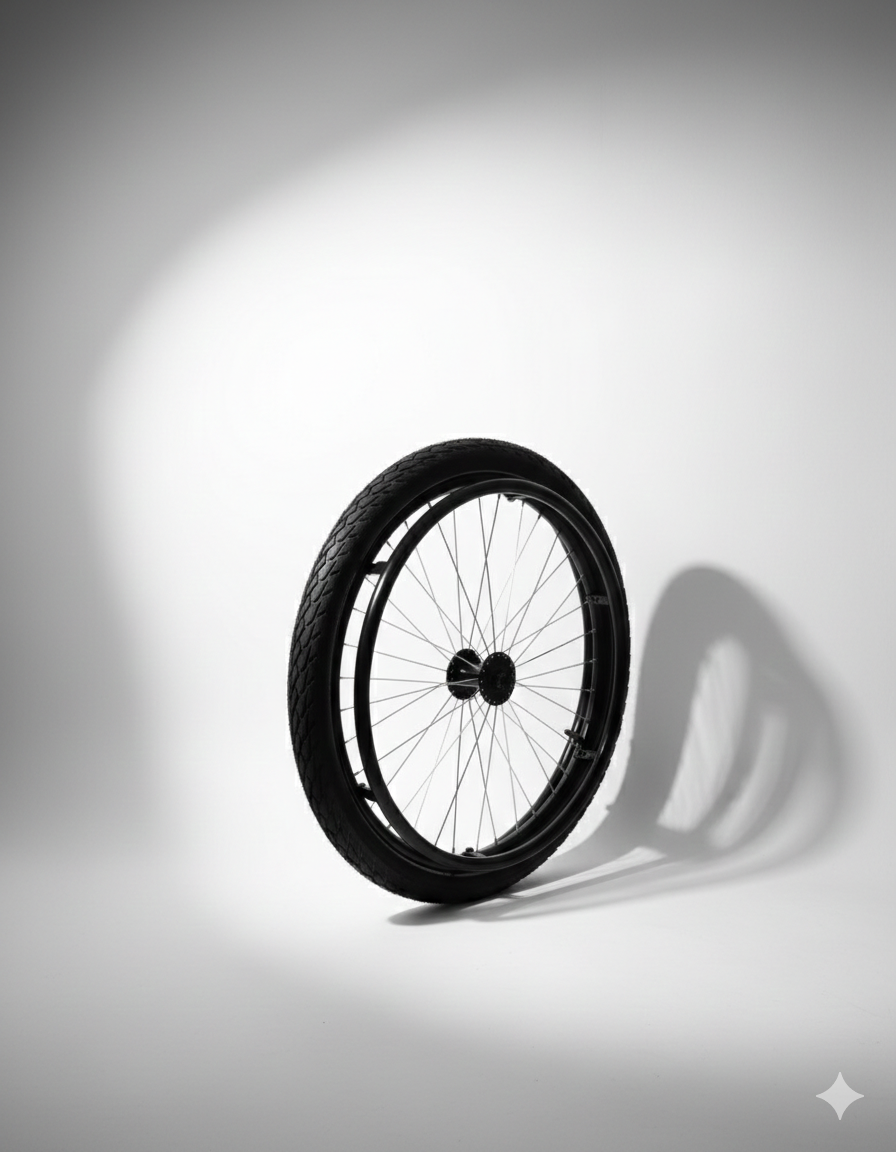 Llanta de 24 pulgadas todo terreno para silla de ruedas con labrado profundo para máximo agarre. Ideal para exteriores y superficies difíciles, esta rueda combina un rin de alta resistencia con un neumático diseñado para absorber impactos. Repuesto duradero y de alto rendimiento para movilidad extrema.